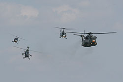 schöne Formation von Bo-105, Tiger, UH-1D und CH-53. Die anderen drei durften